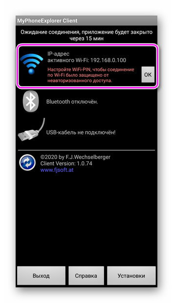 - Установите и откройте клиент на ПК. На смартфоне запустите софт и тапните по Wi-Fi, чтобы установить ПИН-код для соединения.