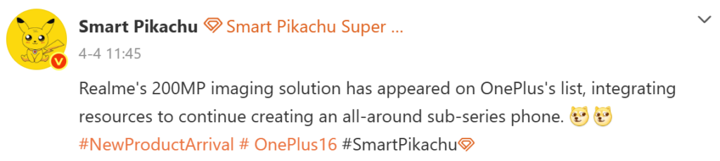 Согласно сообщению Smart Pikachu на Weibo, 200-мегапиксельное решение для обработки изображений, изначально связанное с Realme, теперь появилось в разработке OnePlus. В более ранних сообщениях указывалось, что этот 200-мегапиксельный перископ может использовать сенсор Samsung HP5, который Realme использовала в таких телефонах, как серии Realme 16 Pro и Realme GT 8 Pro.