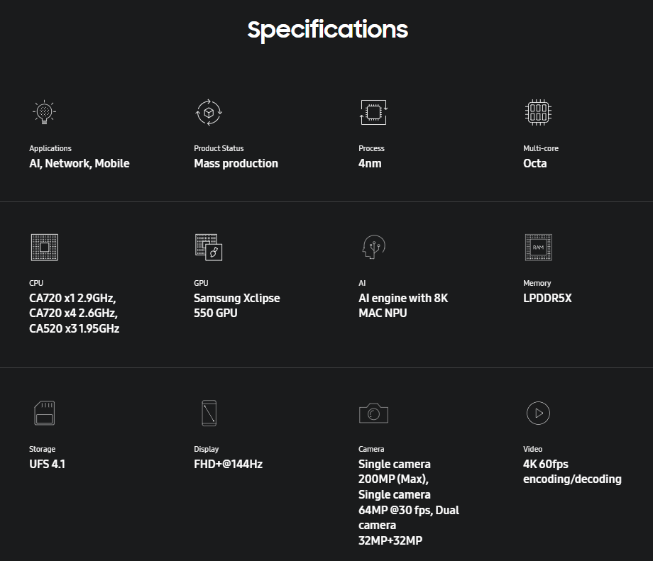 Он построен на обновленном 4-нм технологическом процессе Samsung, а настройка процессора соответствует ожиданиям в этой категории. Вы получаете одно ядро Cortex-A720 с тактовой частотой 2,9 ГГц, а также еще четыре ядра A720 и три ядра A520, ориентированных на повышение эффективности. На первый взгляд, ничего необычного, но новые ядра должны обеспечить более плавное переключение приложений и лучшую согласованность при длительном использовании.