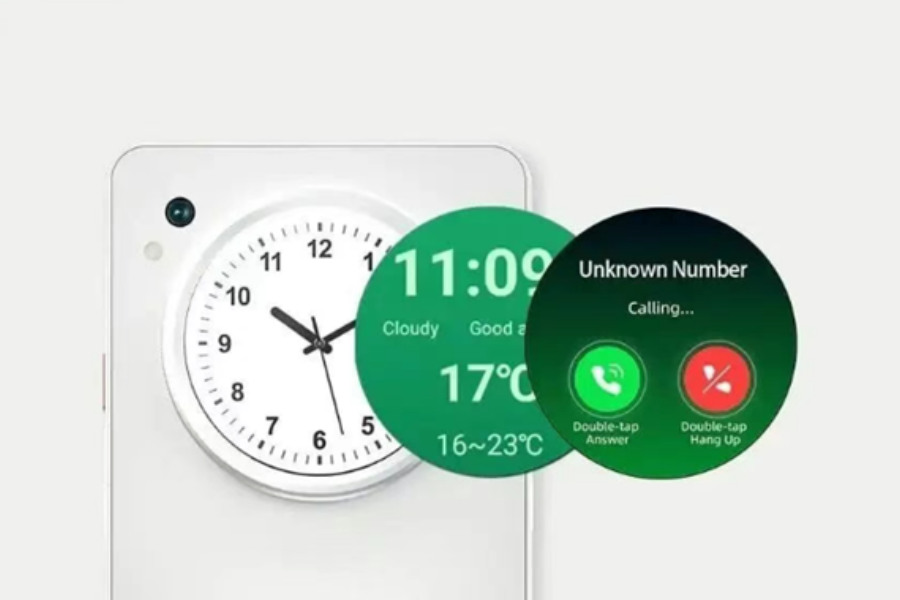 Переверните телефон, и все станет немного более экспериментальным. На задней панели находится круглый ЖК-дисплей с диагональю 1,85 дюйма и разрешением 360 × 360 точек. Вы можете использовать этот маленький экран для проверки уведомлений, просмотра времени или погоды и даже в качестве заднего видоискателя при съемке фотографий.