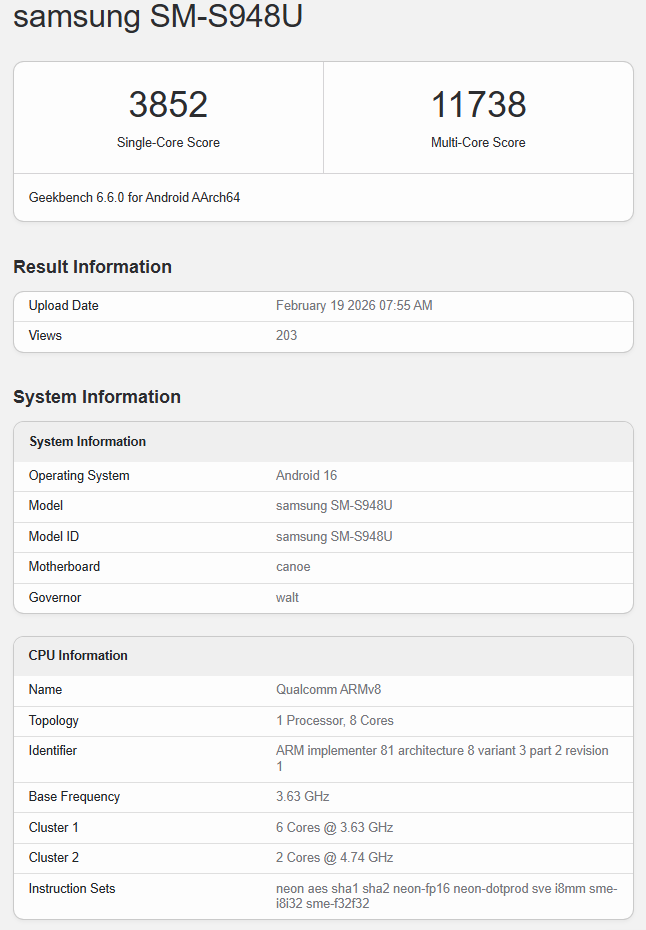 В недавнем обзоре Geekbench 6 показано, что S26 Ultra набрал 3852 балла за одноядерный процессор и 11 738 баллов за многоядерный процессор. Samsung обычно настраивает свои собственные чипы Snapdragon чуть выше, чем в стандартных версиях других телефонов на базе Android, и эта настройка “для Galaxy”, похоже, приносит свои плоды.