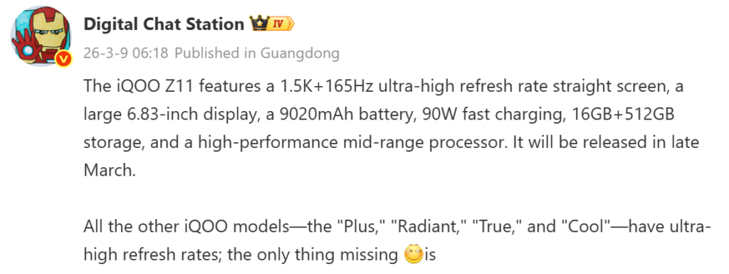 DCS утверждает, что iQOO Z11 будет оснащен высокопроизводительным чипсетом, но не раскрывает его название. Он также сообщил, что устройство будет доступно в конфигурации 16 ГБ + 512 ГБ. Как уже было подтверждено, Z11 будет оснащен аккумулятором емкостью 9020 мАч с поддержкой зарядки мощностью 90 Вт.