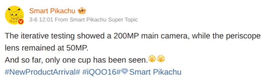 Согласно сообщению Smart Pikachu на Weibo, iQOO 16 в настоящее время тестируется с 200-мегапиксельной основной камерой. Для сравнения, iQOO 15 оснащен 50-мегапиксельным основным сенсором. Говорят, что будущий телефон по-прежнему будет оснащен 50-мегапиксельной перископической телеобъективной камерой, как и его предшественник.