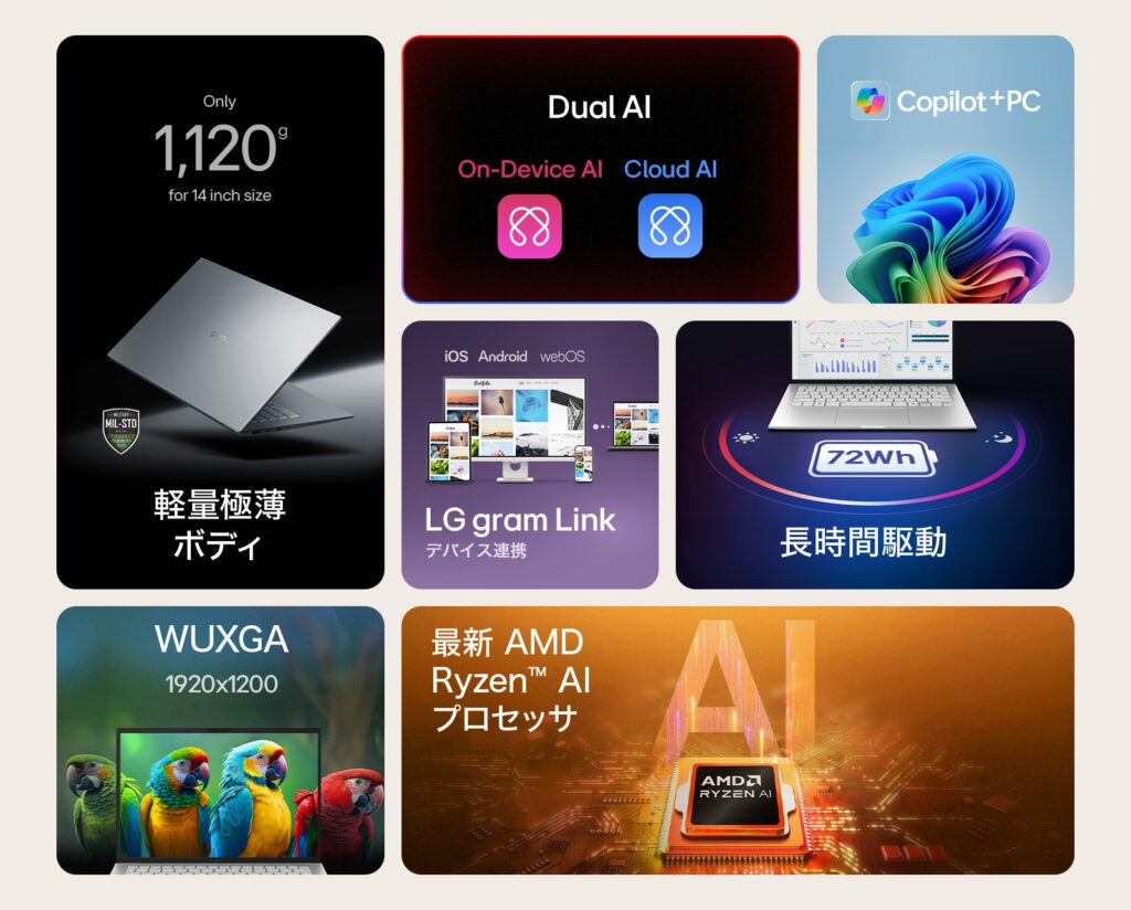 В своей работе LG использует новейшие процессоры AMD Ryzen AI 400-й серии (основанные на платформе Gorgon Point). Начальные модели оснащены процессором Ryzen AI 5 435, 16 ГБ оперативной памяти LPDDR5X и 512 ГБ SSD-накопителя PCIe 4.0. Более дорогие версии, вплоть до Ryzen AI 7 450, могут быть оснащены до 32 ГБ оперативной памяти.