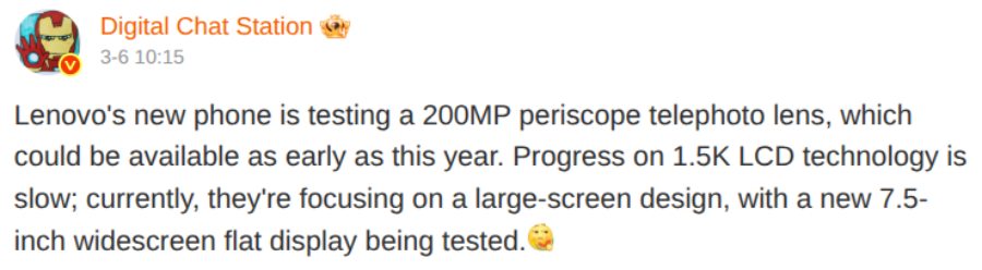 Новая утечка информации предполагает, что Lenovo, возможно, тестирует какое-то необычное оборудование для своих будущих смартфонов. Согласно сообщению в Weibo от известного цифрового чата tipster, в настоящее время Lenovo тестирует 200-мегапиксельную перископическую телеобъективную камеру с большим сенсором для своих следующих телефонов.