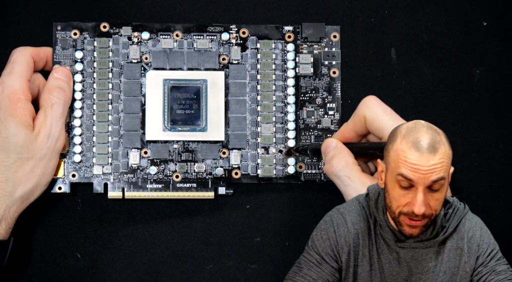 Это была не единственная модификация. Он также применил шунтирующий резистор — хорошо известную (и рискованную) настройку, которая позволяет эффективно обойти встроенные в NVidia ограничения по энергопотреблению. Цель была проста: позволить графическому процессору потреблять гораздо больше энергии, чем позволяют стандартные настройки.