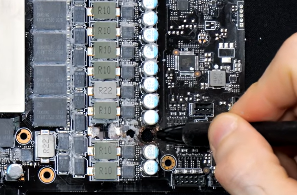 Плата не вышла из строя во время тестовой проверки или стресс-теста. Вместо этого она перестала работать на холостом ходу. Согласно видео, в печатной плате были прожжены две большие дыры, и по крайней мере один конденсатор был снят с платы из-за сильного нагрева.