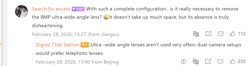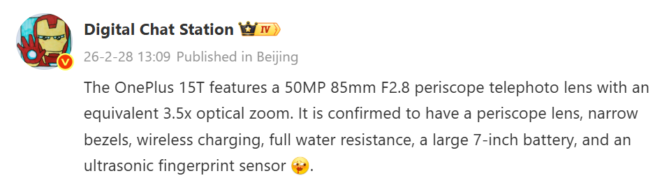 Известный консультант DCS заявил, что OnePlus 15T будет оснащен 50-мегапиксельным перископическим объективом с разрешением 85 мм f/2.8 и подтвержденным оптическим увеличением. Он также упомянул узкие рамки, беспроводную зарядку, полную водонепроницаемость, батарею, начинающуюся с 7-го разрядника, и ультразвуковой датчик отпечатков пальцев. В разделе комментариев к своему посту на Weibo DCS отметил, что сверхширокополосные камеры имеют относительно низкую частоту использования и что он предпочел бы установку с двумя камерами, ориентированную на телеобъектив. Это говорит о том, что в OnePlus 15T может отсутствовать сверхширокоугольный объектив, как в прошлогоднем OnePlus 13T.