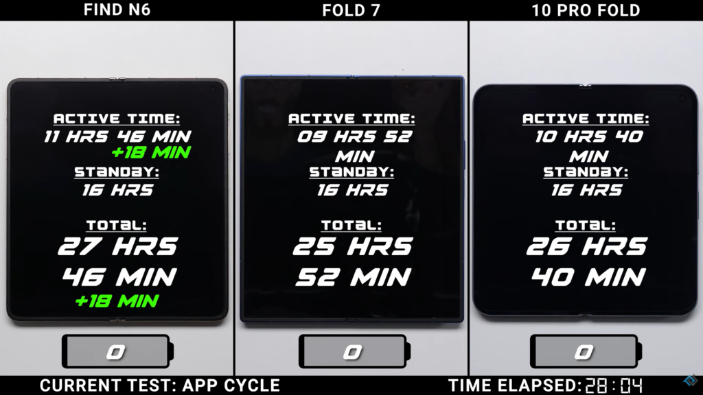 В итоге Find N6 занял первое место, его продолжительность составила 27 часов 46 минут. Модель Pixel 10 Pro Fold заняла второе место за 26 часов и 40 минут, в то время как Galaxy Z Fold 7 финишировал с результатом 25 часов и 52 минуты. Разрывы невелики, но они достаточно постоянны, чтобы выделяться.