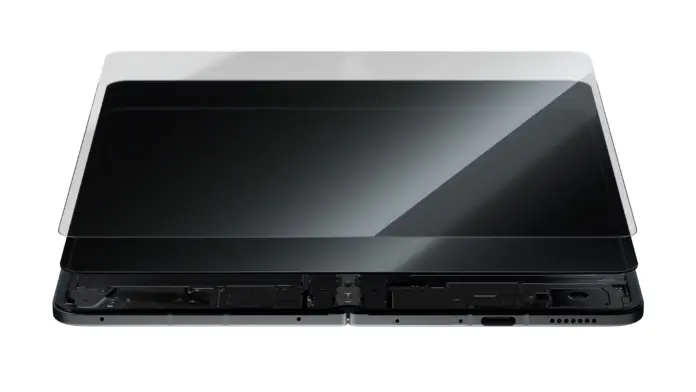 Панель оснащена новым купольным стеклом с эффектом памяти, которое позволяет складывать дисплей практически без складок, восстанавливая его плоскостность на 99,9% после складывания.