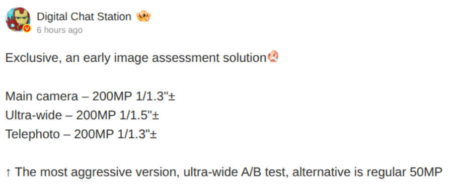 Согласно более раннему отчету, устройство может использовать 200-мегапиксельные сенсоры в своих широкоугольных, сверхширокоугольных и телеобъективных камерах. В цифровом чате Tipster появилась дополнительная информация по этой теме.