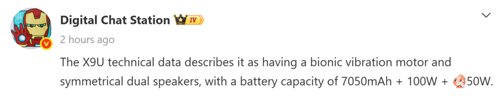 В соответствующих новостях tipster Digital Chat Station сообщил, что Find X9 Ultra будет оснащен массивной батареей емкостью 7050 мАч, что согласуется с предыдущим отчетом, в котором заявлялась такая же емкость. Кроме того, утечка информации из DCS также раскрывает другие детали, такие как бионический вибромотор, симметричные двойные динамики, проводная зарядка мощностью 100 Вт и беспроводная зарядка мощностью 50 Вт.