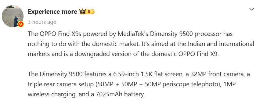 Этот новый чип представляет собой слегка урезанную версию существующего чипа Dimensity 9500, который используется в Find X9. Таким образом, пользователь утверждает, что X9s — это усовершенствованная версия Find X9.