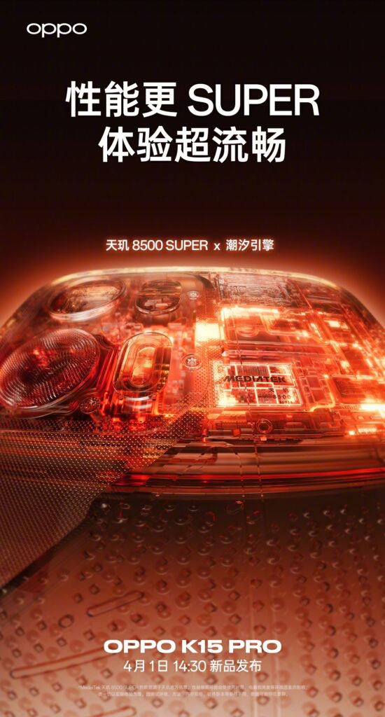 Oppo K15 Pro оснащен 6,59-дюймовым дисплеем, поддерживающим частоту обновления 144 Гц. В основе устройства лежит чипсет MediaTek Dimensity 8500 SUPER, который Oppo называет движком Tide Engine для оптимизации производительности.