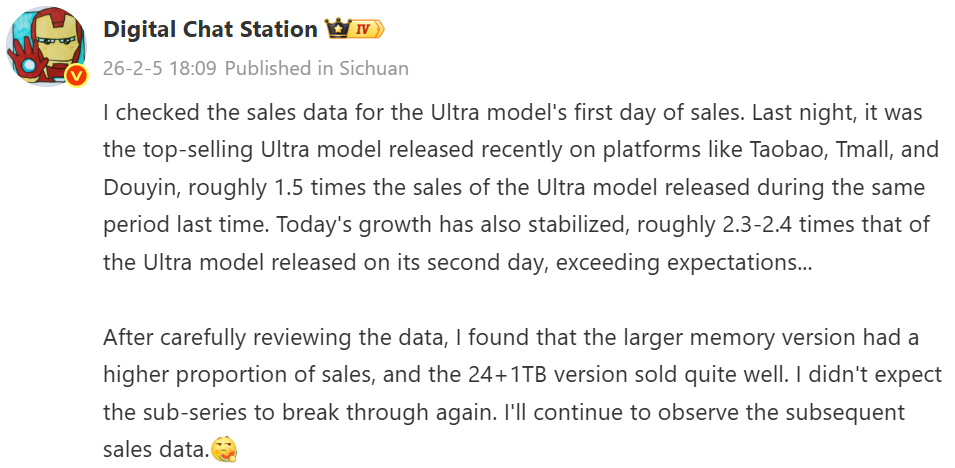 Ранее в цифровом чате tipster сообщалось, что первые показатели последней модели Ultra превзошли ожидания. JD.com Данные платформы показали, что продажи версии Ultra за тот же период выросли примерно в 1,5 раза по сравнению с предыдущей моделью Pro. Продажи продолжили расти, достигнув примерно 2,3-2,4-кратного роста за второй день по сравнению с предыдущим поколением Pro. Консультант также отметил большой интерес к версиям с большим объемом памяти, причем конфигурация 24 ГБ+1 ТБ пользовалась заметным спросом у первых покупателей.