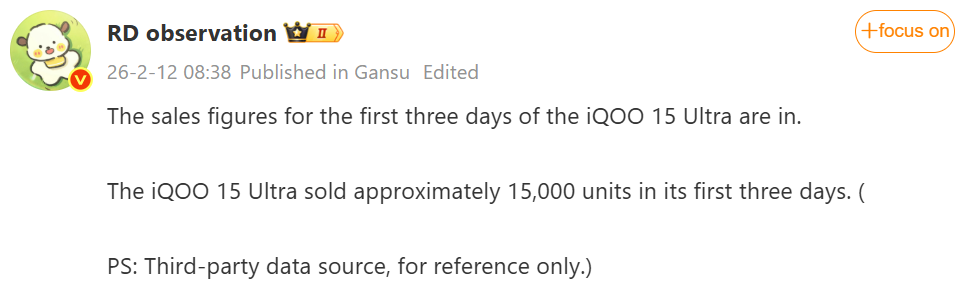 Согласно показанному выше техническому блогеру, iQOO 15 Ultra был распродан во время первого цикла продаж, и за первые три дня было отправлено около 15 000 единиц. Данные получены из сторонних источников, и их следует рассматривать скорее как ориентировочные, чем официальные. Несмотря на это, цифры свидетельствуют о высоком первоначальном спросе, особенно учитывая премиальное позиционирование устройства.