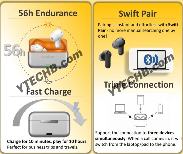 Согласно отчету, наушники оснащены динамическими динамиками диаметром 12,4 мм с поддержкой пространственного 360-градусного звучания и активным шумоподавлением, достигающим 50 дБ при частотном диапазоне до 5000 Гц. Голосовые вызовы выполняются с помощью массива из шести микрофонов с шумоподавлением на базе искусственного интеллекта. Настройка звука доступна через приложение Realme Link.