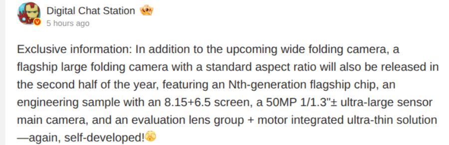 В результате новой утечки, опубликованной tipster Digital Chat Station, появились первые подробности о предстоящем выпуске Huawei Mate X8. Говорят, что устройство оснащено 6,5-дюймовым внешним экраном и 8,15-дюймовым внутренним складывающимся дисплеем — это немного больше, чем то, что предлагает Huawei в Mate X7.