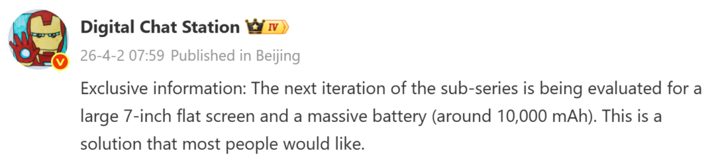 Вышеупомянутая утечка от DCS предполагает, что Redmi оценивает телефон с 7-дюймовым плоским дисплеем и аккумулятором емкостью около 10 000 мАч. Хотя он не уточнил название устройства, некоторые предположили в комментариях, что он мог иметь в виду Redmi Note 17 Pro Max.