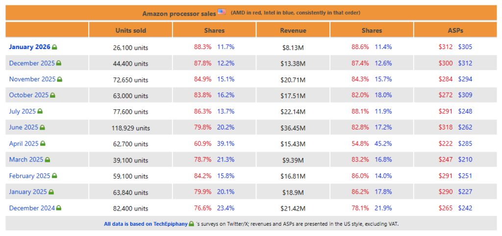 Новые данные, отслеживающие продажи процессоров на Amazon в США, показывают резкое снижение по сравнению с аналогичным периодом прошлого года в январе 2026 года. Согласно данным, собранным аналитиками TechEpiphany, за месяц было продано всего 26 100 процессоров. Само по себе это может показаться не таким уж страшным, но это означает резкое падение на 51% по сравнению с январем 2025 года.