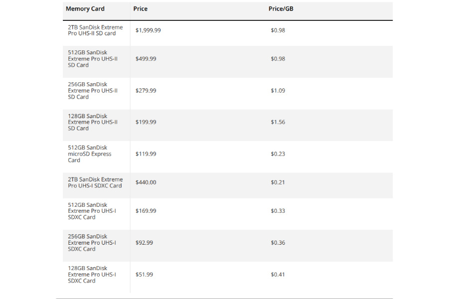 Тем не менее, цена отличается даже в рамках собственной линейки SanDisk. Стоимость карты UHS-II емкостью 2 ТБ составляет примерно 1 доллар за гигабайт, что соответствует цене за гигабайт версии емкостью 512 ГБ, но остается значительно дороже, чем у аналогов UHS-I, которые могут стоить всего 0,21 доллара за гигабайт. Даже новые карты microSD Express от SanDisk намного дешевле в пересчете на гигабайт.