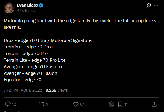 В подробностях, которыми поделился эксперт Эван Бласс на X, упоминаются Edge 70 Pro, Edge 70 Pro+ и Edge 70 Pro Lite. Сообщается, что внутри компании они имеют кодовые названия “Terrain”, ”Terrain+“ и «Terrain Lite”. Это позволило бы еще больше расширить линейку Edge 70, которая уже включает в себя стандартный Edge 70, а также Fusion, Fusion+ и более дорогой вариант Motorola Signature. На данный момент линейка немного перегружена, но это также дает Motorola возможность ориентироваться на разные ценовые категории.