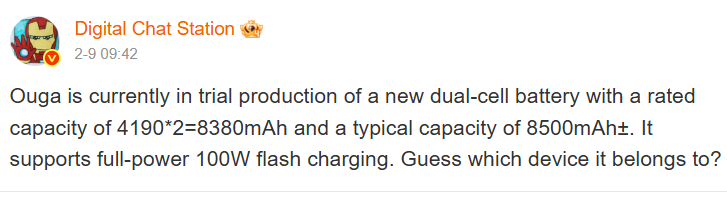 Согласно китайскому сообщению tipster Digital Chat Station, Oppo запустила в пробное производство новый двухэлементный аккумулятор с обычной емкостью около 8500 мАч. Если быть точным, то это значительно превосходит большинство современных флагманов.