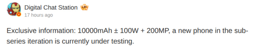Согласно недавнему сообщению Digital Chat Station, новое устройство, которое в настоящее время тестируется, оснащено массивной батареей емкостью 10 000 мАч в паре с быстрой зарядкой мощностью 100 Вт, а также 200-мегапиксельной основной камерой.