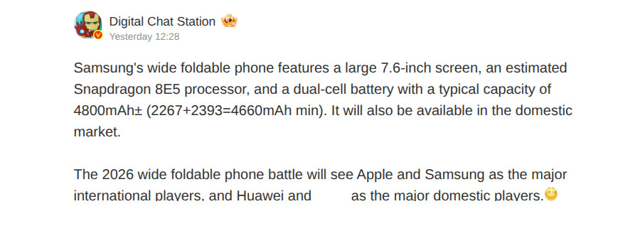 Согласно утечке, проведенной tipster Digital Chat Station, в предстоящем смартфоне wide foldable будет использоваться процессор Snapdragon 8 Elite 5-го поколения. Это позволит привести его в соответствие с производительностью будущих Galaxy Z Fold 8 и Z Flip 8.