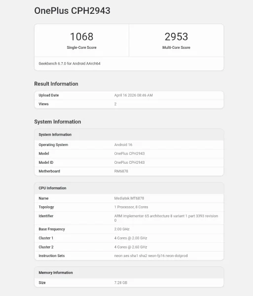 В связи с этим в списке Geekbench появился чипсет для OnePlus Nord CE 6 Lite. Смартфон появился в тесте под номером модели CPH2943 и оснащен чипом MediaTek Dimensity 7400.