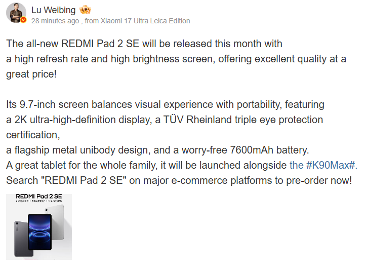 Pad 2 SE будет представлен официально вместе с несколькими другими продуктами, включая REDMI Book Pro 2026 и K90 Max. Похоже, что Xiaomi снова объединяет все в одно мероприятие.