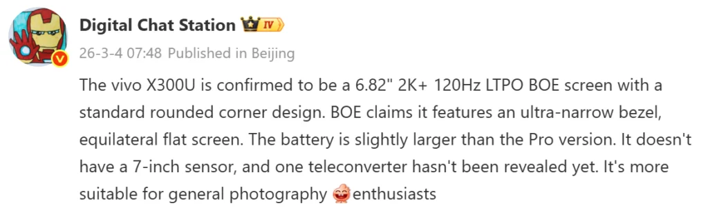 Согласно утечке, Vivo X300 Ultra будет оснащен 6,82-дюймовым дисплеем, поставляемым BOE. Сообщается, что панель имеет разрешение 2K +, частоту обновления 120 Гц и поддерживает технологию LTPO для динамической регулировки частоты обновления. Сообщается, что экран будет иметь плоский дизайн с правильными закругленными углами вместо четырехугольных панелей, которые использовались в предыдущих моделях.