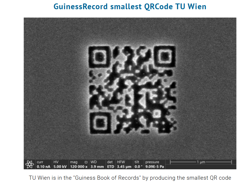 Исследовательская группа из Венского технологического университета (TU Wien), работающая с австрийско-немецким стартапом Cerabyte, создала самый маленький QR-код в мире. Размер крошечного кода составляет всего 1,98 квадратных микрометра, что делает его меньше, чем у большинства бактерий. Это достижение было официально признано Книгой рекордов Гиннесса. Исследователи говорят, что цель проекта — не только установить рекорд по размеру, но и продемонстрировать новые возможности для будущих технологий хранения данных.