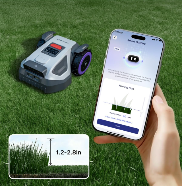 Мотоблок ANTHBOT M5 обеспечивает эффективное скашивание с уклоном до 45%, что делает его подходящим для большинства газонов в жилых домах. Он оснащен регулируемой высотой скашивания от 1,2 до 2,7 дюймов и пятью свободно вращающимися лезвиями, которые обеспечивают гладкое покрытие, напоминающее ковер. Интеллектуальное планирование траектории позволяет пользователям выбирать различные схемы скашивания через приложение.