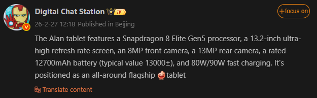 Подробности получены из Digital Chat Station на Weibo. Источник не назвал устройство, но его технические характеристики соответствуют тому, что большинство ожидало бы от обновленного Pad 6 Pro или, возможно, аналога под брендом iQOO, построенного на аналогичном оборудовании.