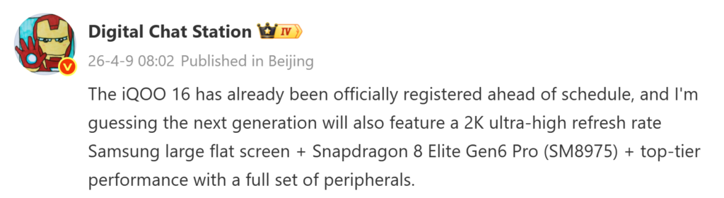 Как упоминалось выше, компания DCS утверждает, что iQOO 16 будет работать на процессоре Snapdragon 8 Elite 6 Pro поколения. Также сообщается, что устройство будет оснащено дисплеем Samsung с разрешением 2K, плоским дизайном и очень высокой частотой обновления. В недавнем отчете сообщалось, что экран может поддерживать частоту обновления 165 Гц или 185 Гц.