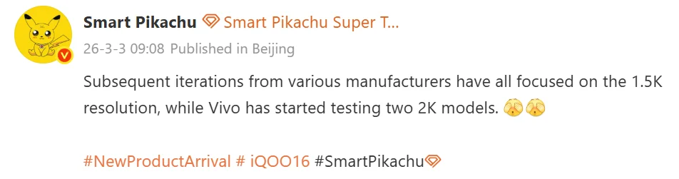 Хэштег iQOO 16, использованный в публикации на Weibo, предполагает, что он мог бы сохранить дисплей с более высоким разрешением 2K вместо перехода на панели с разрешением 1,5 тыс., которые используют многие конкуренты.