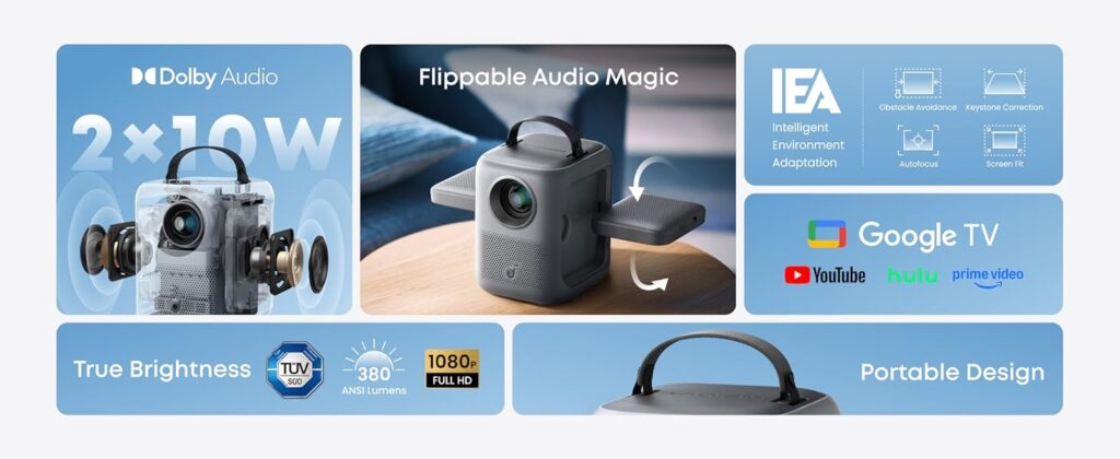 Устройство работает под управлением операционной системы Android TV с интерфейсом Google TV. Пользователи получают доступ к потоковым приложениям, таким как Netflix, YouTube и Prime Video, непосредственно на проекторе. Для подключения он поддерживает Wi-Fi 5 и Bluetooth 5.1. Физические порты включают HDMI с поддержкой ARC, порт USB-A и вход AUX.