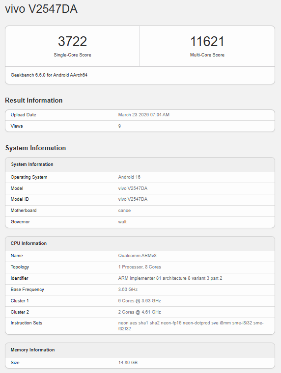 Устройство, обнаруженное на Geekbench, имеет номер модели V2547DA, который, как полагают, является вариантом спутниковой связи. Оно получило оценку в 3722 балла за одноядерный процессор и 11 621 балл за многоядерный процессор. Эти цифры в значительной степени соответствуют ожиданиям от топового Android-флагмана этого года.