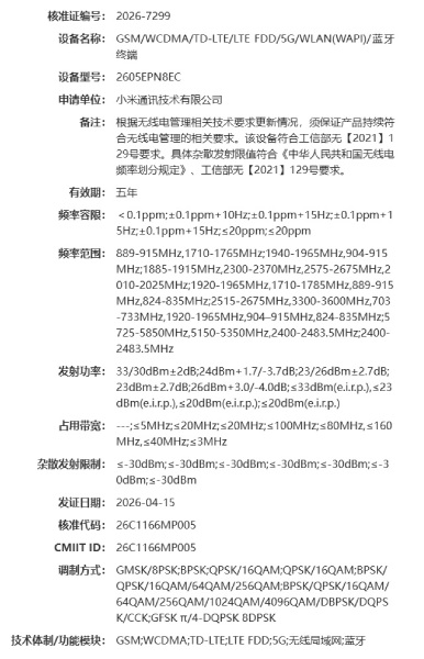 Xiaomi 17 Max снова попал в заголовки газет, на этот раз из-за регистрации в регулирующих органах Китая. Новое устройство Xiaomi с модельным номером 2605EPN8EC прошло сертификацию в Министерстве промышленности и информационных технологий Китая (SRRC).