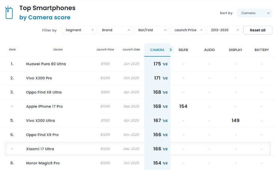 С точки зрения конкуренции, Xiaomi 17 Ultra не смогла обогнать Huawei Pura 80 Ultra, занявшую первое место в рейтинге. Тем не менее, ей удалось превзойти несколько известных устройств, включая Magic 8 Pro, Pixel 10 Pro XL и iPhone 16 Pro Max.