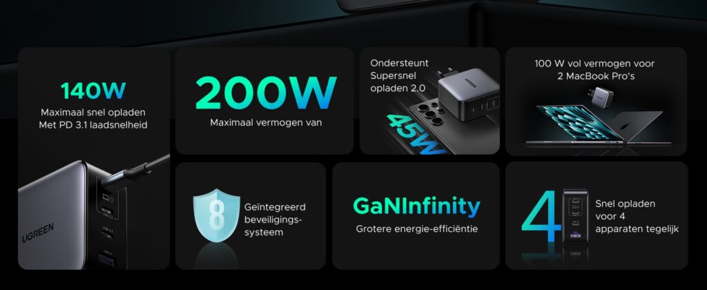 Зарядное устройство имеет ту же четырехпортовую компоновку с тремя портами USB-C и одним портом USB-A. Первый порт USB-C поддерживает мощность до 140 Вт при использовании PD 3.1. Второй порт USB-C обеспечивает мощность до 100 Вт, а третий порт USB-C обеспечивает мощность до 30 Вт. Порт USB-A обеспечивает мощность до 22,5 Вт. Общая мощность составляет 200 Вт, что позволяет заряжать два ноутбука мощностью до 100 Вт каждый одновременно.