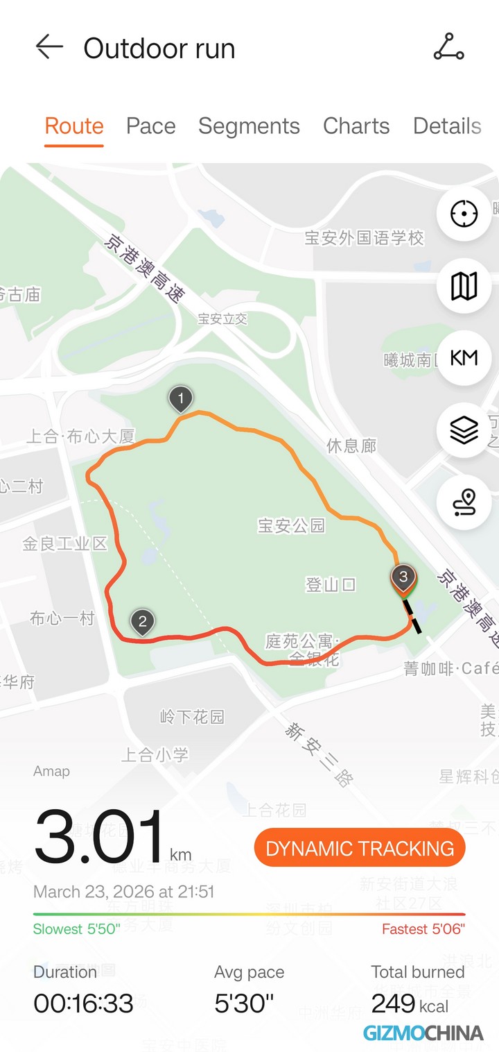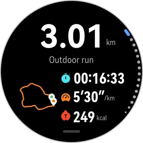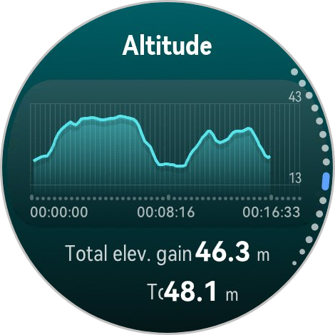 Мое любимое место для пробежек — спортивный парк с неровной трассой длиной 545 метров, часть которой проходит через лесистую местность. Записанный маршрут неизменно демонстрировал отличную последовательность, круг за кругом. Точность дистанции также была проверена в другом спортивном парке с 3-километровой трассой в горах. После прохождения одного круга и нескольких дополнительных секунд ходьбы в конце, часы показали расстояние в 3,01 километра — это самый точный показатель на сегодняшний день. Практически для всех бегунов точное отслеживание маршрута позволяет лучше отслеживать темп, поступь и другие важные показатели во время тренировки.