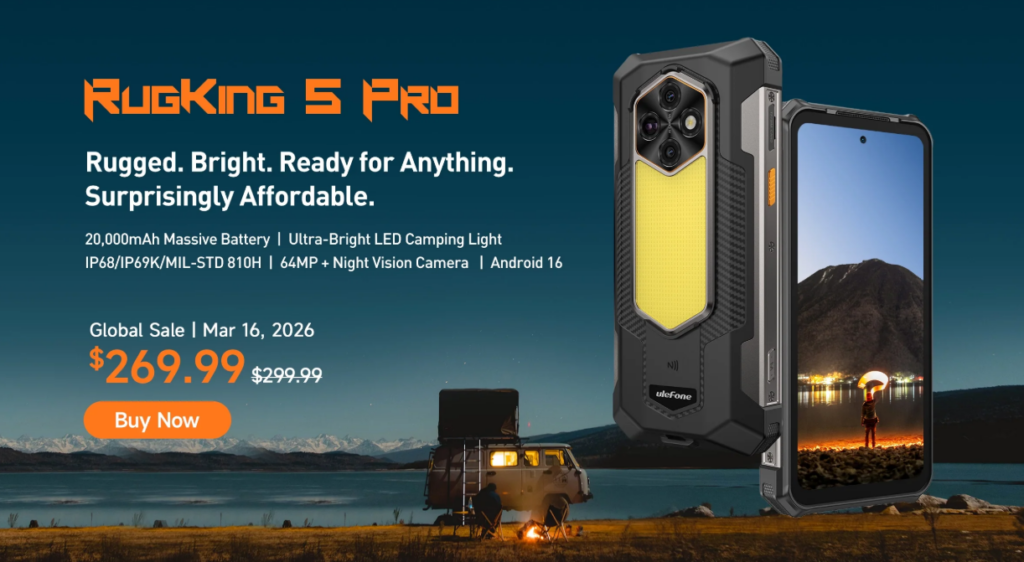 Компания Ulefone официально представила RugKing 5 Pro во всем мире 16 марта 2026 года. Устройство позиционируется как бюджетная альтернатива Armor 24 и отличается длительным временем автономной работы, высокой прочностью и практичными инструментами для работы на открытом воздухе. По доступной цене в 269,99 долларов он ориентирован на пользователей, которым нужна надежность в сложных условиях без больших затрат.